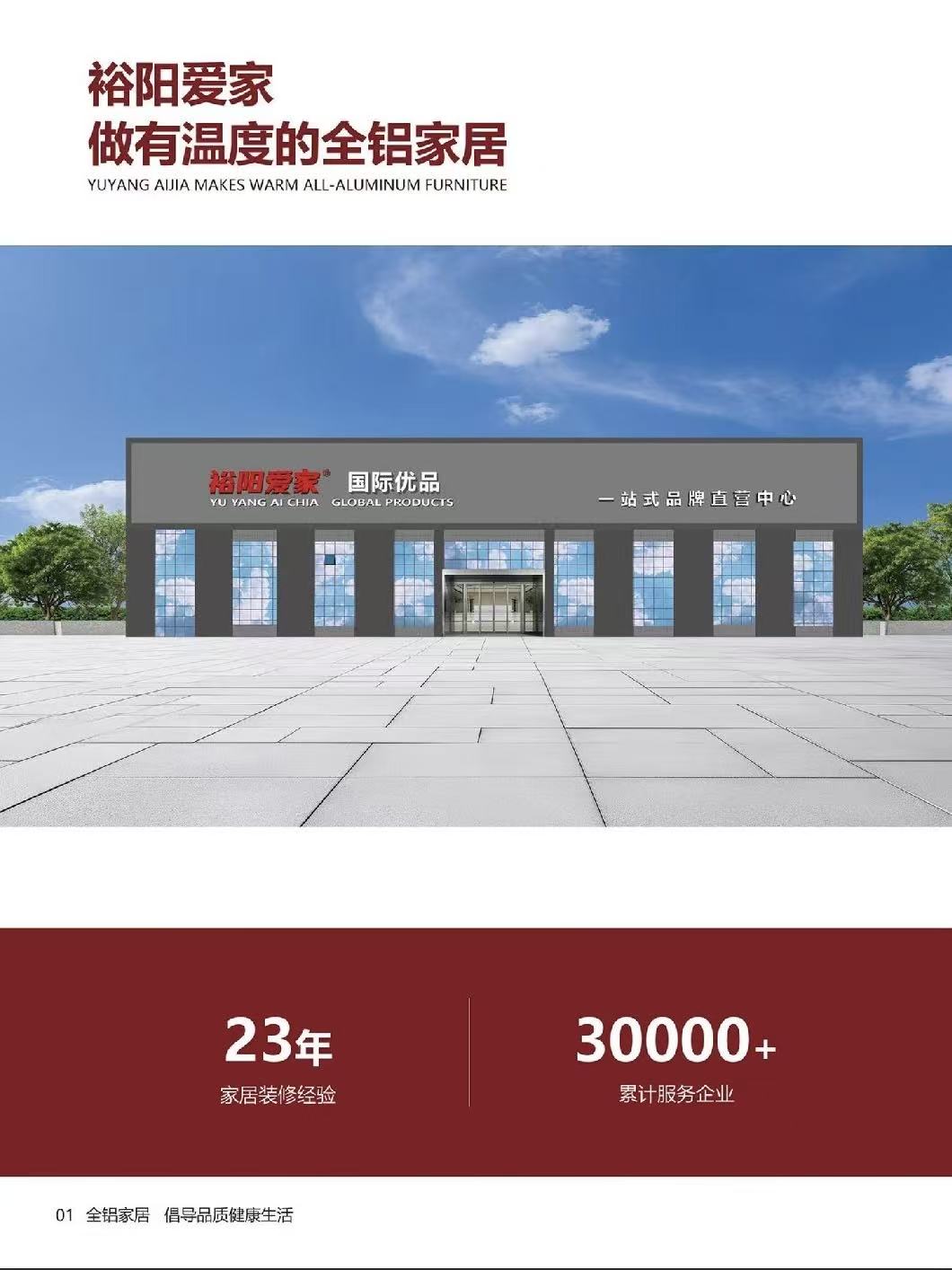 裕阳爱家全铝家居&裕阳门窗是一家专注于全铝全屋家居定制与高端/系统门窗的品牌。以铝代木,以航空级铝蜂窝板为原料,集成了多项科技化、人性化功能,打造出高品位的全铝全屋整装产品,市场前景巨大。全铝产品具有生态环保、无甲醛、无有害物质、坚固耐用、清洁方便、防潮防水、防火阻燃、防蛀防腐、个性设计、可回收的优势。 全挤压铝材,挤压一体成型,强度高不易变形。质量高于传统木质家具,更稳定。硬度高,连接处更牢固。直接冲洗清洁、不腐蚀、不褪色、不生锈。 裕阳品牌作为20多年的老品牌,已服务无数客户,始终把服务放在重中之重。也赢得了无数回头客,得到 的高度评价。 裕阳爱家全铝家居致力于为顾客提供更健康、环保、智能化产品。